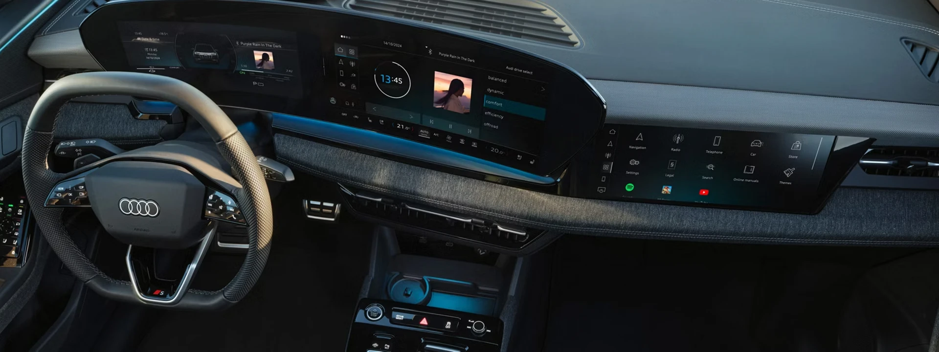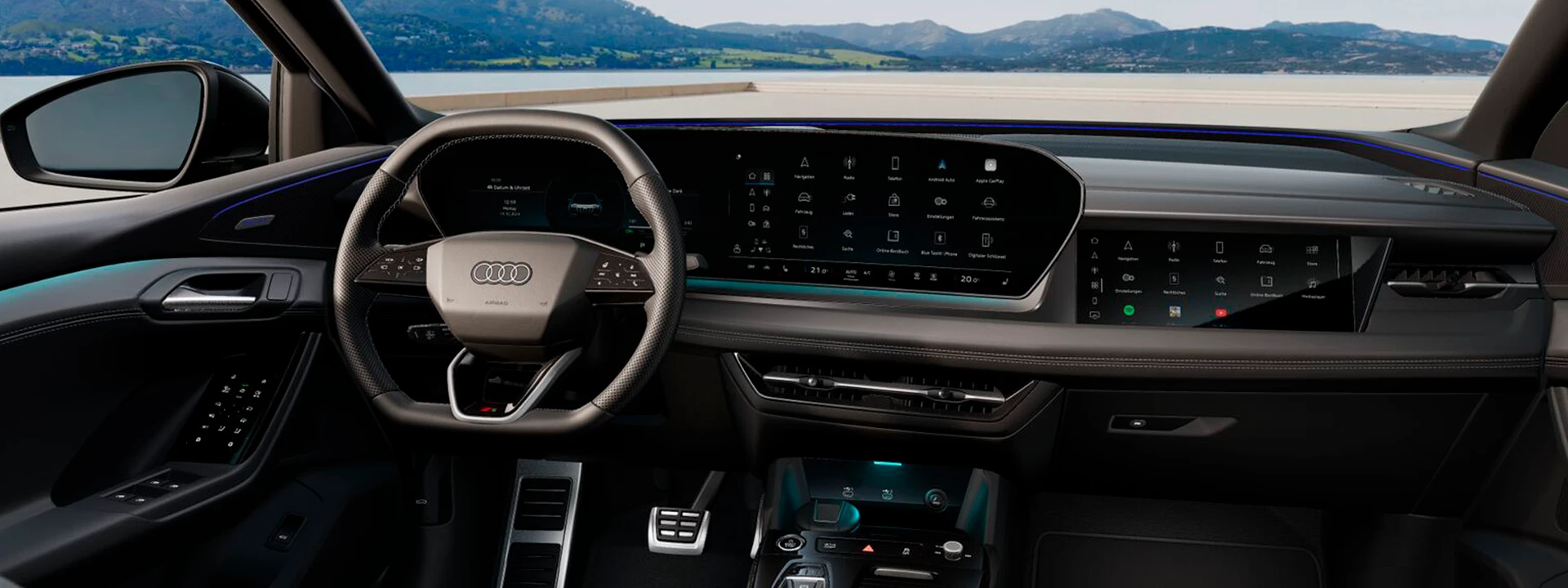 Experimente o novo interior digital com recursos como tela panorâmica, head-up display de realidade aumentada, Audi Assistant, unidade de controle da porta do motorista, iluminação interativa dinâmica.