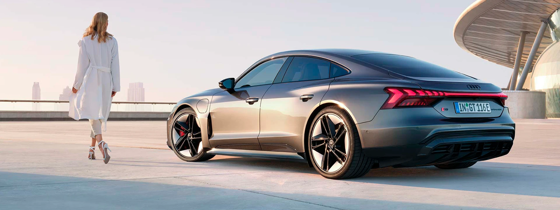 A linha de ombro ousada pronunciada, assim como o difusor traseiro diferenciado, dá ao Audi RS e-tron GT uma aparência impactante de força. Por sua vez, a linha de teto levemente inclinada, que se alonga até a traseira do veículo, expressa o quanto almeja por velocidade, mesmo quando ele está estacionado.