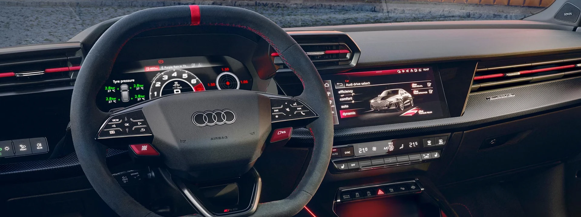 O interior é visivelmente esportivo com o pacote de design RS Vermelho, bancos dianteiros esportivos e volante esportivo achatado. A abordagem da dinâmica de condução também é claramente visível no Audi virtual cockpit plus com um design dos modelos RS selecionável.