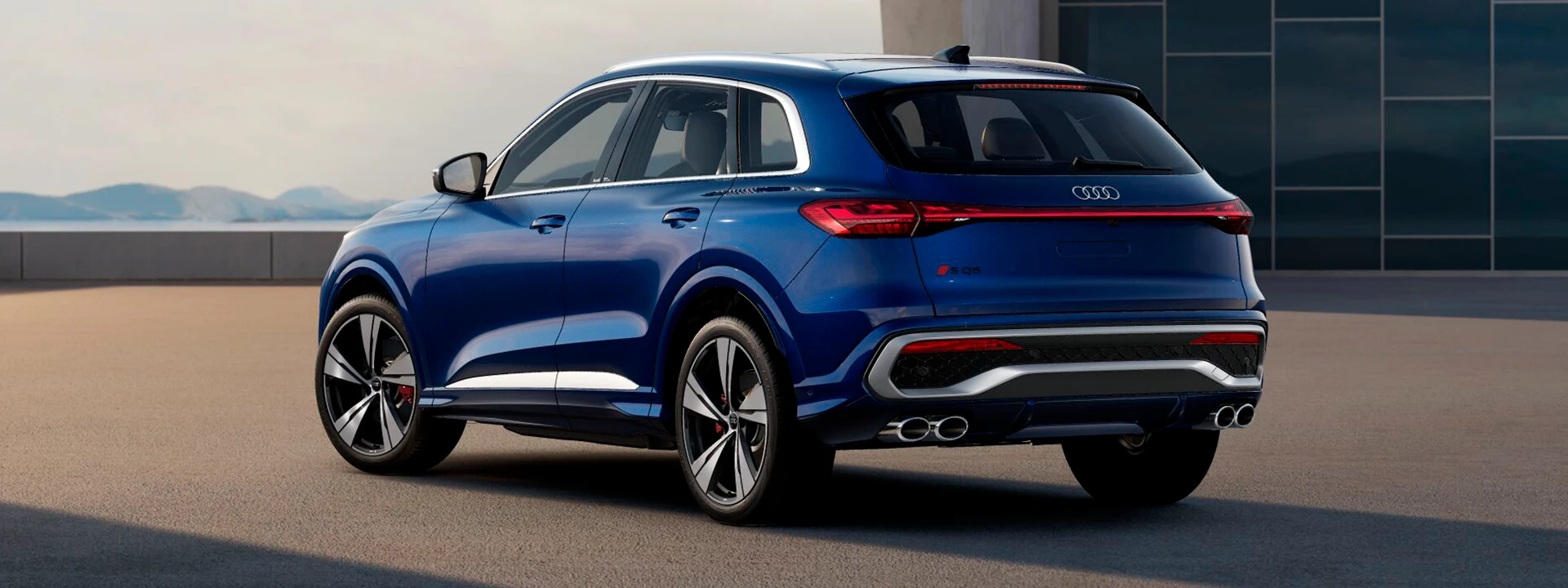O Audi SQ5 exibe uma traseira poderosa com para-choque e difusor exclusivos da linha S, realçados por detalhes em alumínio fosco e ponteiras de escape duplas. A faixa de luz contínua e a luz de projeção nos retrovisores elevam o design a um novo nível de sofisticação.