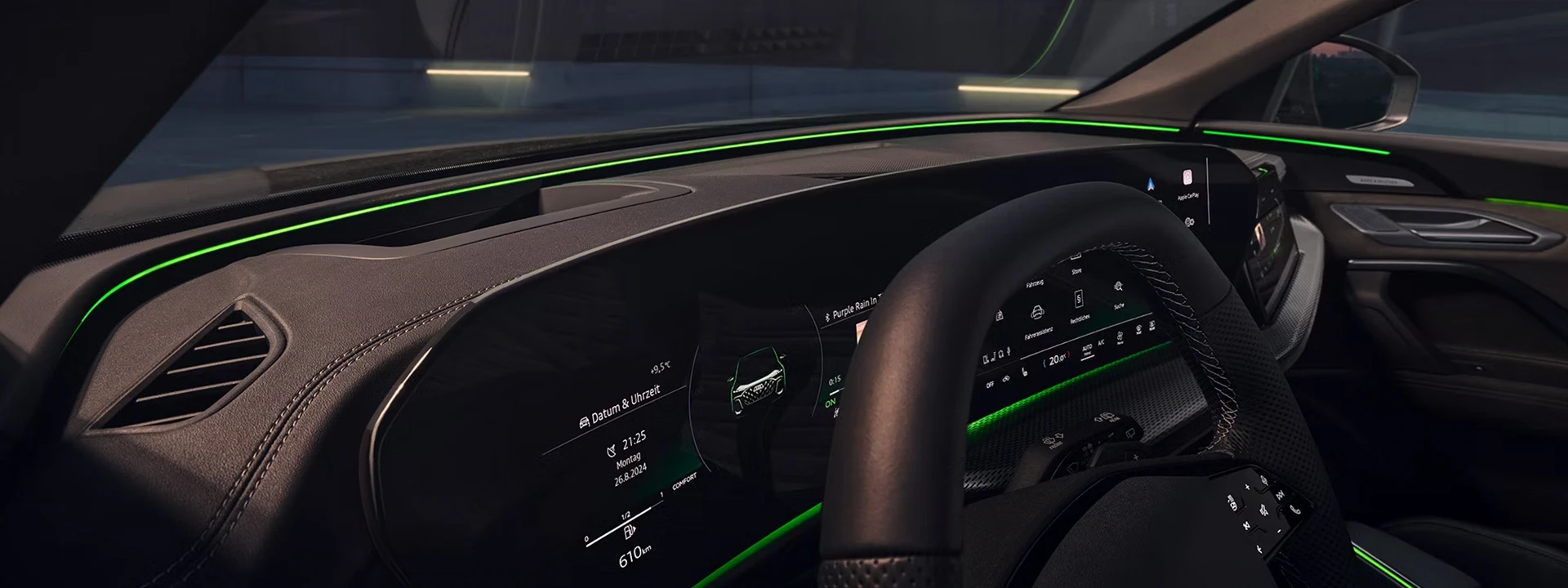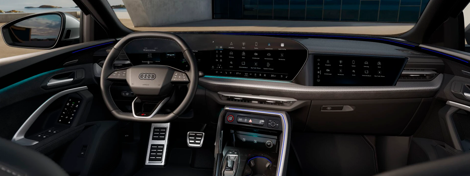 O Audi Virtual Cockpit Plus (11,9 polegadas) e o visor central do MMI (14,5 polegadas) estão integrados à ampla tela panorâmica curva, voltada para o motorista. Com o visor do passageiro do MMI (10,9 polegadas), por exemplo, a navegação e o entretenimento podem ser operados separadamente.