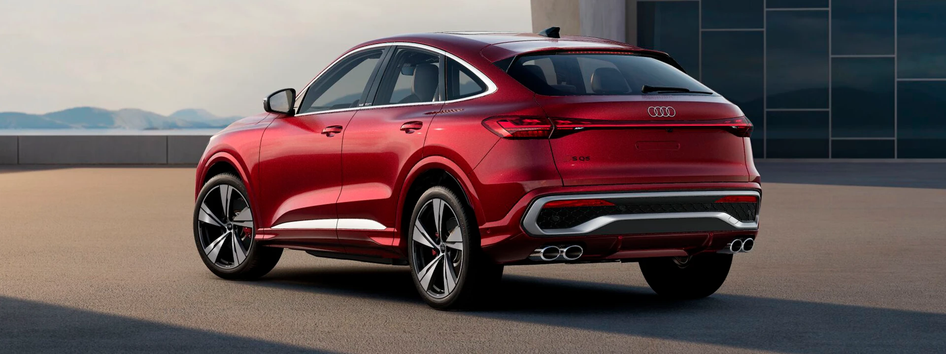 Na traseira do Audi SQ5 Sportback, as quatro saídas de escape da linha S deixam claro seu DNA esportivo. A lanterna traseira contínua reforça a largura marcante e as proporções elegantes do SUV cupê.