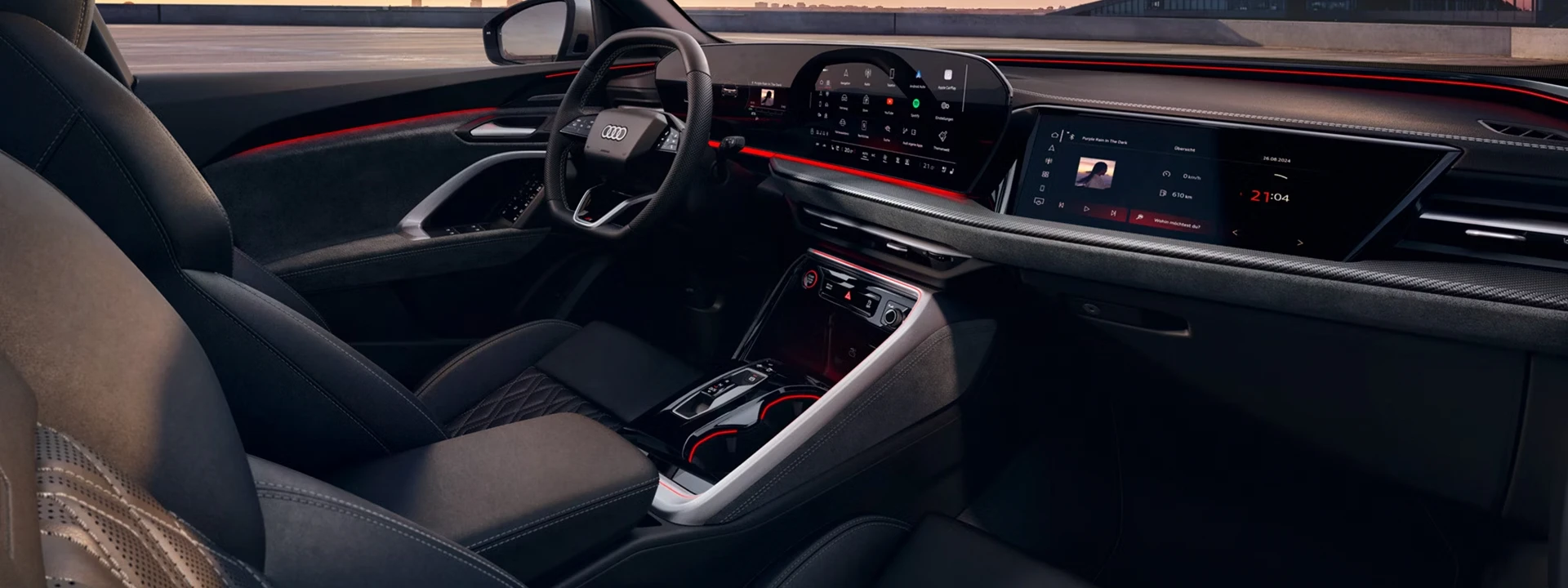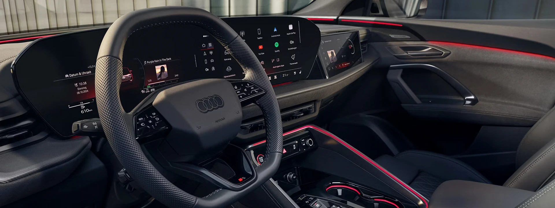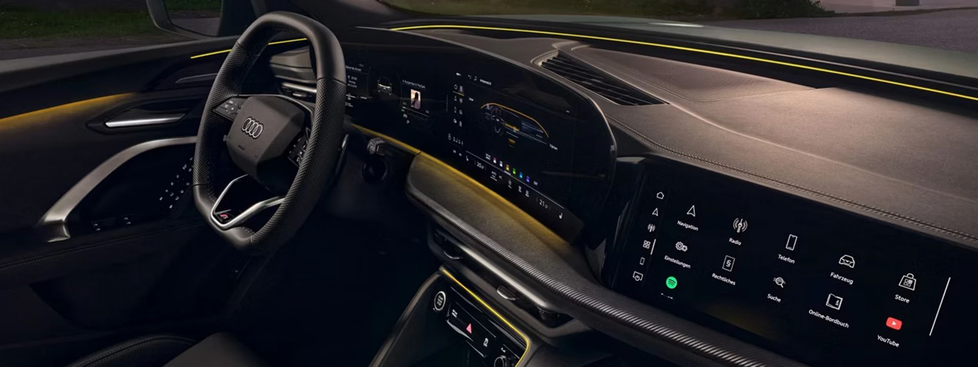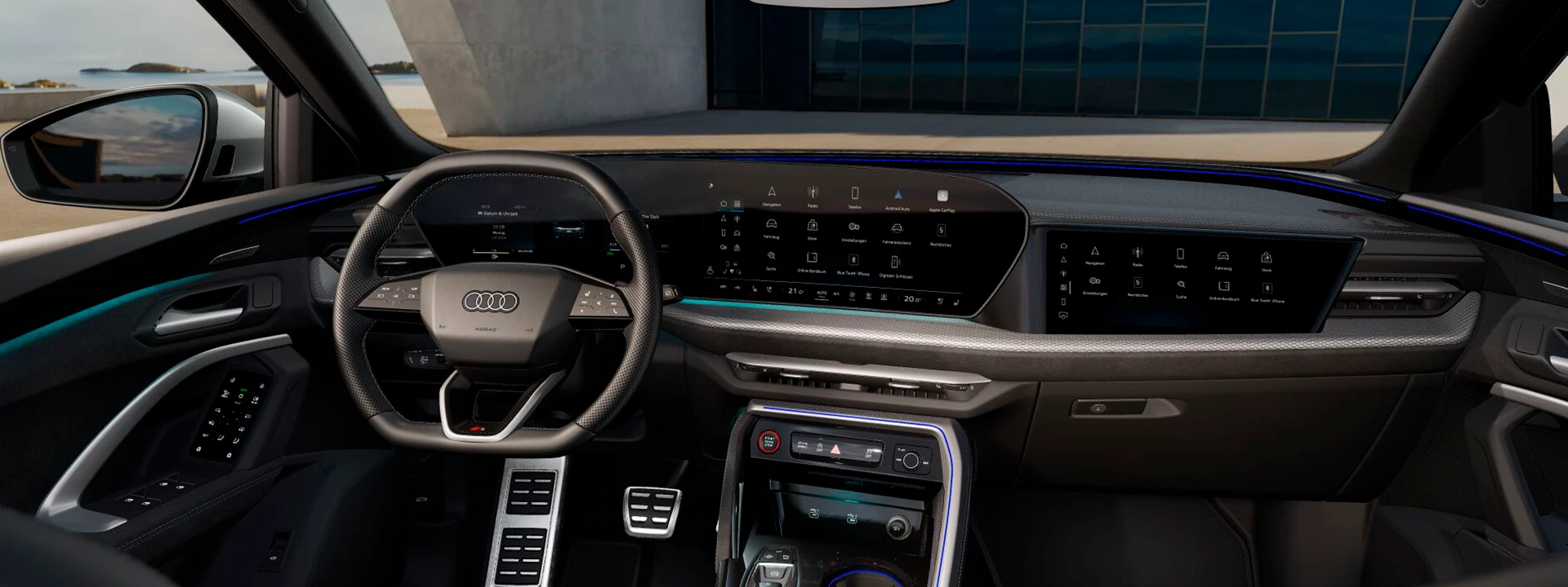 O Audi Virtual Cockpit Plus (11,9 polegadas) e o display central do MMI (14,5 polegadas) estão integrados ao amplo display panorâmico curvo, voltado para o motorista. Com o display do passageiro do MMI (10,9 polegadas), por exemplo, a navegação e o entretenimento podem ser operados separadamente.